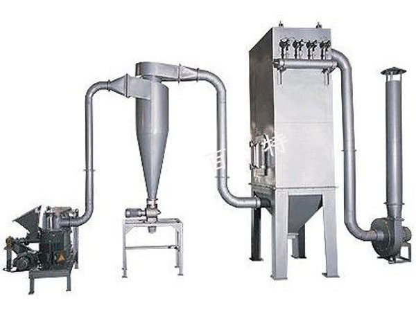 该机成套系统由喂料机、旋风收集器、脉冲除尘器、高压引风机、电控柜等组成。物料由进料装置进入粉碎室,通过主轴的高速运转,使物料相互撞击、摩擦、剪切、挤压而实现粉碎。粉碎后的物料通过分级轮实现粗细粉的分离,粗粉流入粉碎腔再次粉磨,净化的气体由引风机排出。